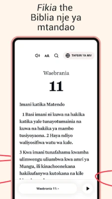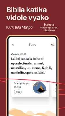 Ndani ya Biblia Nje ya Mtandao ya YouVersion, utapata tafsiri maarufu na rahisi kusoma ya Biblia Habari Njema (BHN), ikikupa uelewa wa kina wa Neno. Kwa wale wanaopendelea kusikiliza, programu hii inajumuisha pia Biblia ya sauti ya bure, ikikupa fursa ya kusikiliza sura au mistari yoyote. Ni muhimu kutambua kuwa kipengele cha sauti kinahitaji muunganisho wa intaneti. Urambazaji ni rahisi, ukikupa uwezo wa kuruka moja kwa moja kwenye sura au mstari wowote bila usumbufu. Pia unaweza kutafuta mistari mahususi kwa mada mbalimbali kama vile imani, tumaini, msamaha, au hofu, na inasaidia lugha zote mbili, Kiswahili na Kiingereza, ikipanua wigo wa watumiaji wake.