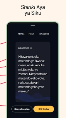 Ili kuimarisha safari yako ya kiroho ya kila siku, Biblia Nje ya Mtandao ya YouVersion inatoa "Mstari wa siku" na "Maombi ya kila siku," inayokuhimiza kuungana na Mungu mara kwa mara. Usisahau kuweka alamisho na kuhifadhi mistari unayoipenda ili kuirejea kwa urahisi au kutafakari baadaye. Zaidi ya hayo, unaweza kubuni picha za kuvutia zenye mistari ya Biblia na kuzishiriki na marafiki na familia kupitia majukwaa maarufu kama WhatsApp, Facebook, au Instagram, ukieneza Neno na kuhamasisha wengine. Biblia Nje ya Mtandao ya YouVersion imeundwa kukupa uzoefu kamili na wa kibinafsi wa Neno la Mungu, popote na wakati wowote unaohitaji.